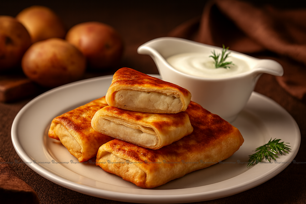 Блины с начинкой из картофеля с жареным лучком- очень вкусный и сытный перекус. На тонкий блинчик выкладываетса начинка, сворачивается конвертиком. Блины обжариваются с двух сторон на разогретой сковороде с добавлением небольшого количества растительного масла. Подаются со сметаной.