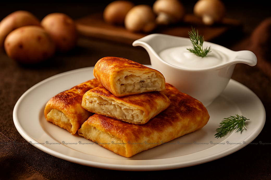 Популярное блюдо русской кухни. Блины с картофелем и грибами прекрасно дополнят ваш обед в качестве основного блюда и подойдут для сытного перекуса. На тонкий блинчик выкладывается начинка, сворачивается конвертиком. Блинчики обжаривают на разогретой сковороде с добавлением небольшого количества растительного масла, подают к столу со сметаной.