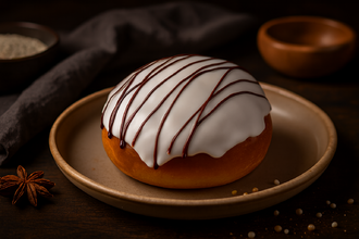 Дрожжевая сдобная булочка, покрытая сверху вкусной сахарной помадой и оформленная шоколадной сеточкой.