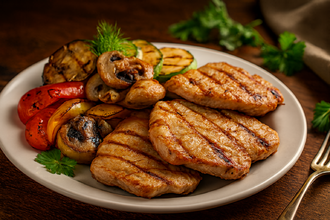 Ну какой же праздник без сочной, дразнящей своим бесподобным вкусом и ароматом отбивной, приготовленной на гриле! Подготовленные медальоны из свиной вырезки толщиной 1-1,5 см слегка отбивают, натирают специями и растительным маслом, жарят на гриле. Отлично сочетается со свежими овощами и овощами- гриль.
