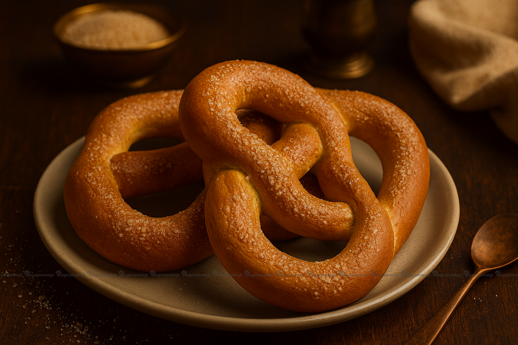 Румяный, аппетитный крендель из сдобного теста с сахарной корочкой скрасит любое чаепитие.