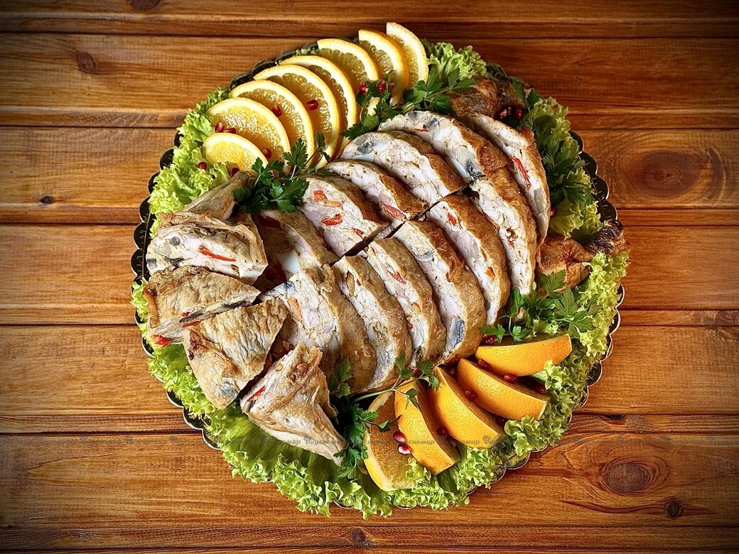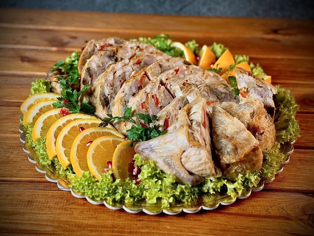 | Состав | Курица тушка, мякоть курицы, перец болгарский, сыр, грибы, яйцо куриное, масло растит., желатин, соль, специи, оформление (апельсин, лист салата). |