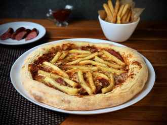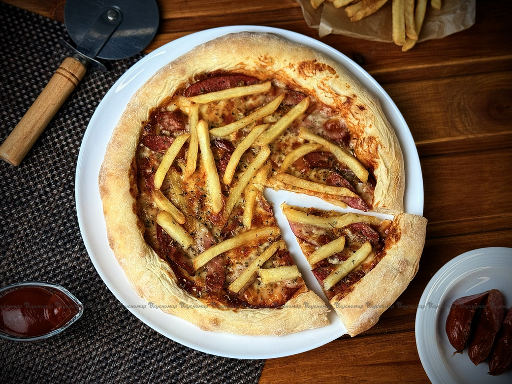 | Состав | Тесто для пиццы (мука в/с, вода, дрожжи, масло растительное, соль, сахар), начинка (сыр для пиццы, колбаски охотничьи, соус для пиццы, картофель фри). |
