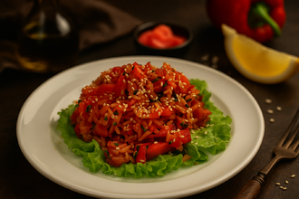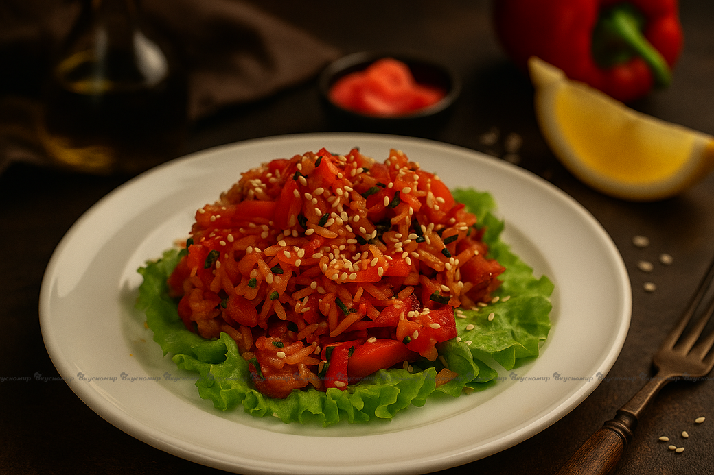 | Состав | Рис, помидор свежий, перец болгарский, имбирь маринованный, соевый соус, масло оливковое, кунжут, приправы. |