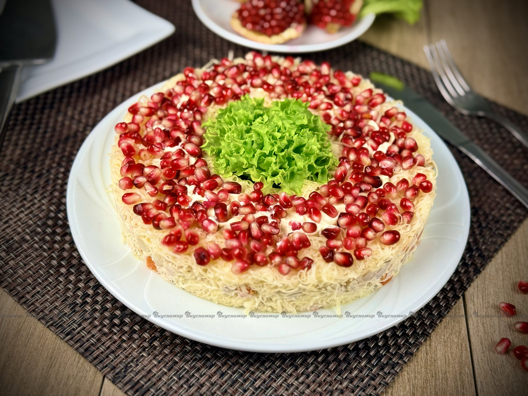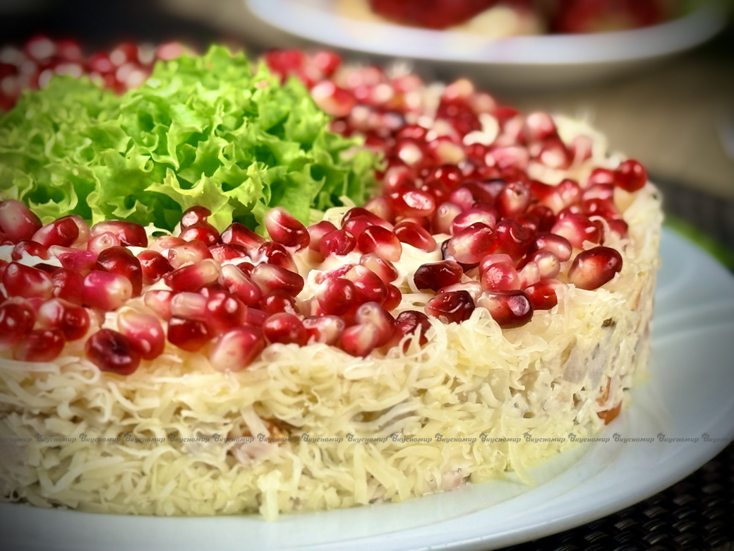 Яркий, нарядный салат. Помимо оригинального и приятного вкуса салат выглядит по-настоящему сказочно и аппетитно. Ингридиенты выкладываются слоями в форме браслета. Сверху оформляем зернами граната.