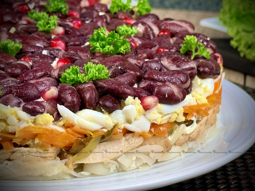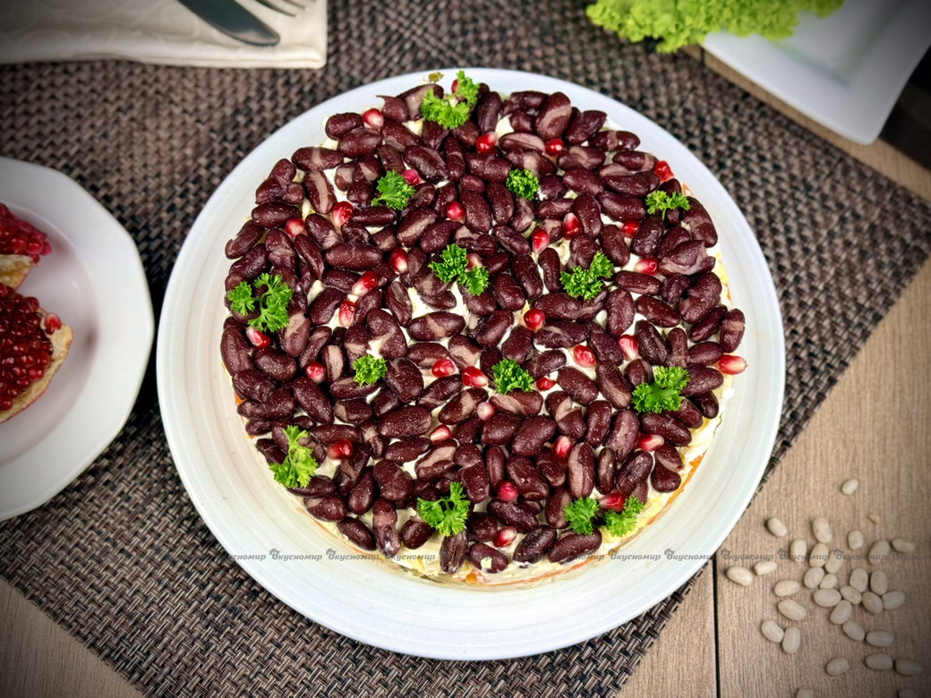 | Состав | Куриная грудка, фасоль красная консервированная, картофель, морковь, огурец соленый, яйцо куриное, майонез, зерна граната, зелень петрушки. |