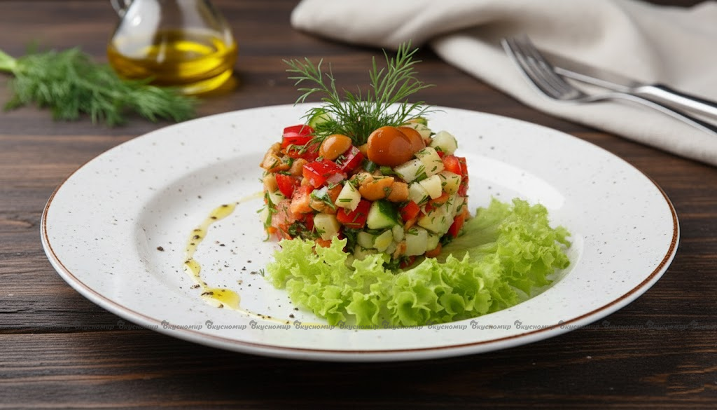 | Состав | Картофель отварной, грибы маринованные, огурец свежий, перец болгарский, помидор свежий, лук зеленый, зелень укропа, масло растительное, соль, специи. |
