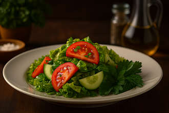 Не зря говорят – все гениальное просто! Что может быть проще и вкуснее, чем салат из свежих налитых помидоров и хрустящих огурцов? Это классика кулинарного искусства. Добавление в блюдо пряных листьев кресс-салата, зелени петрушки, укропа и лука делают его еще более насыщенным и вкусным, а заправка из золотистого растительного масла завершает ароматный ансамбль. Салат отлично подходит под любой вид гарнира.