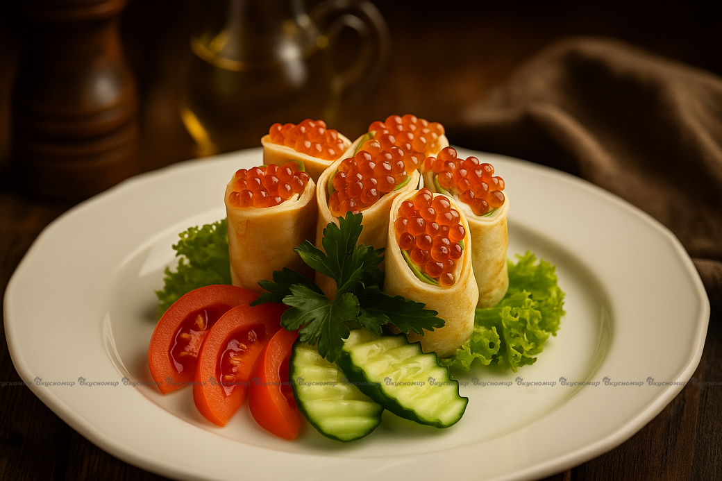 Такая закуска станет настоящим украшением праздничного стола. Невероятно вкусная! Тонкий блинчик поливается соусом из нежного сливочного сыра и сметаны, сворачивается рулетиком вместе с листом салата. Рулетик разрезается на части, каждая часть оформляется красной икрой и декорируется свежими овощами.