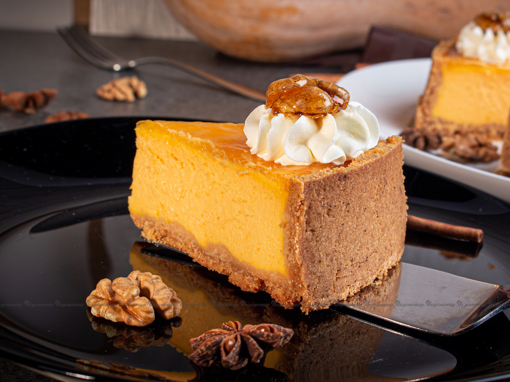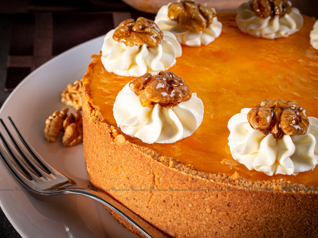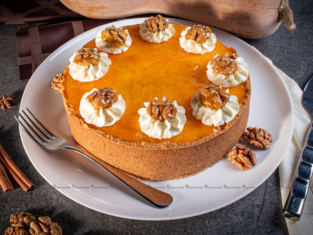 | Состав | Песочная основа (мука в/с, масло сливочное, сахар, яйцо куриное, маргарин для выпечки), начинка (сыр филадельфия, тыква, яйцо куриное, сахарная пудра, крахмал кукурузный), оформление (начинка тыквенная, сыр филадельфия, орех карамелизированный, сливки кондитерские, сахарная пудра). |