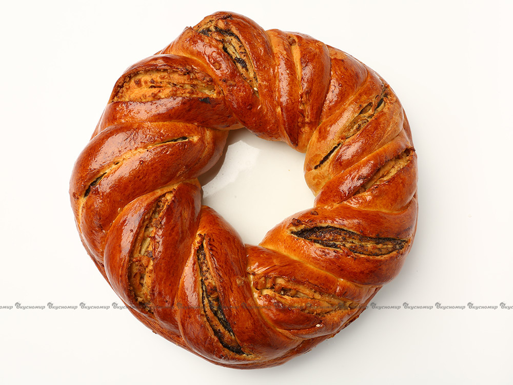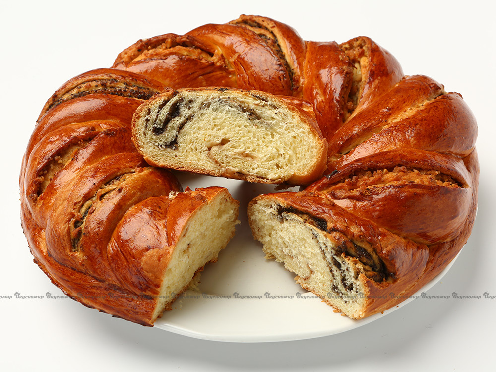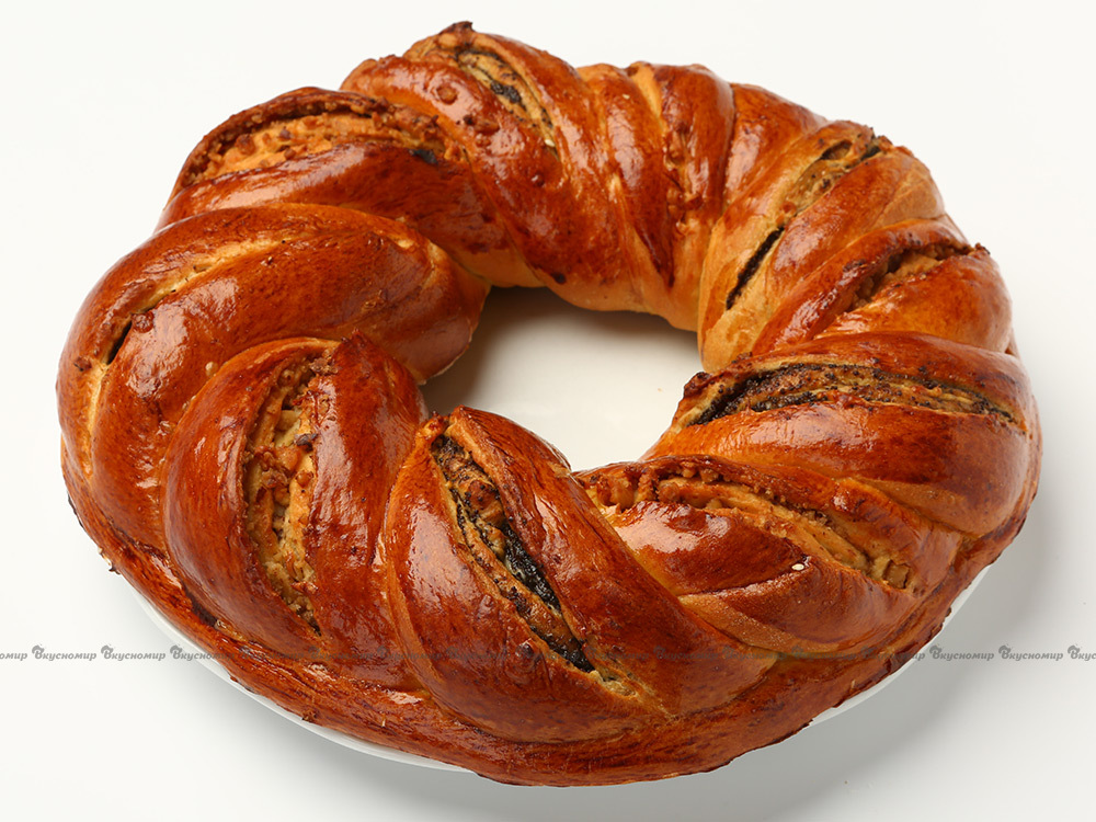 | Состав | Тесто сдобное дрожжевое (мука, молоко, маргарин для выпечки, сахар, яйцо куриное, дрожжи, соль, ванилин. Начинка (орехи, корица, сахар, маковая начинка). |