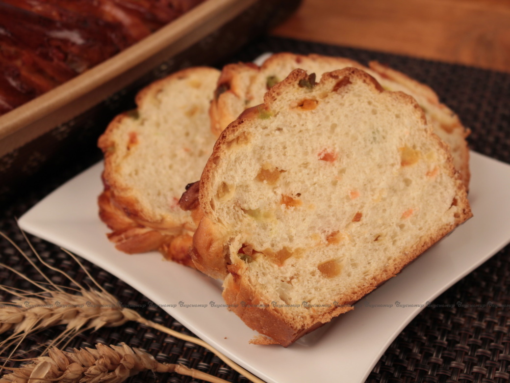 | Состав | Тесто сдобное (мука пшеничная в/с, сахар, яйцо куриное, молоко, маргарин для выпечки, сметана, масло сливочное, дрожжи прессованные, коньяк, соль, цедра лимона, ваниль, ароматизатор ром, куркума), цукаты. |