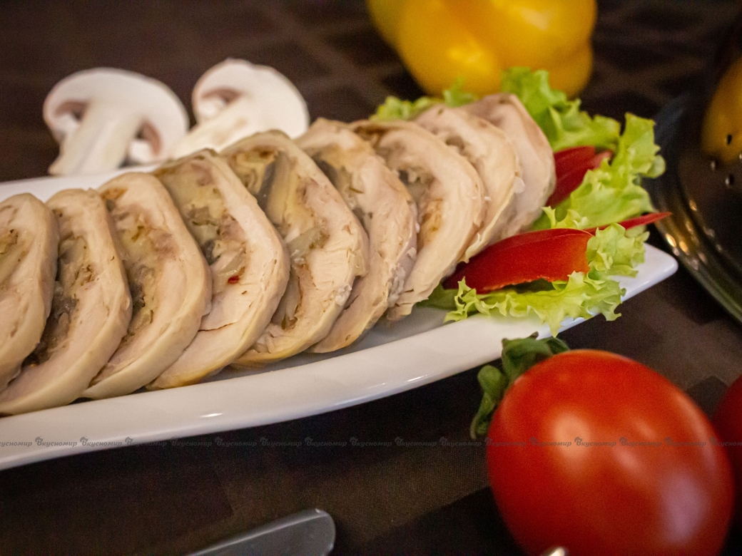 | Состав | Филе куриного окорочка, масло растительное, соль, специи; начинка (грибы шампиньоны, лук репчатый, сыр твердый, масло растительное, соль, специи). |