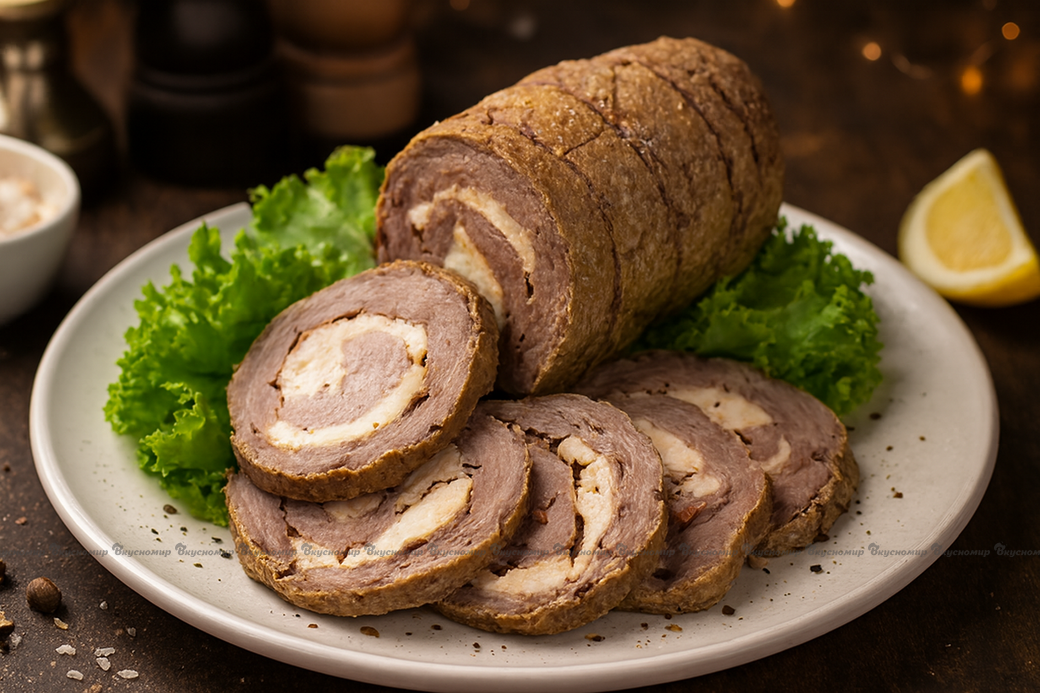 Праздничная мясная закуска. На отбитый тонкий пласт молодой говядины выкладывается тонкий слой куриной грудки, посыпается специями, сворачивается в рулет и запекается. Благодаря особому способу запекания сохраняет большинство питательных веществ и не теряет сочность даже при остывании.