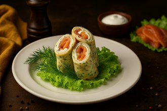 | Состав | Блины (мука, молоко, яйцо, зелень, соль, сахар), начинка (семга малосольная, сыр филадельфия, сметана). |