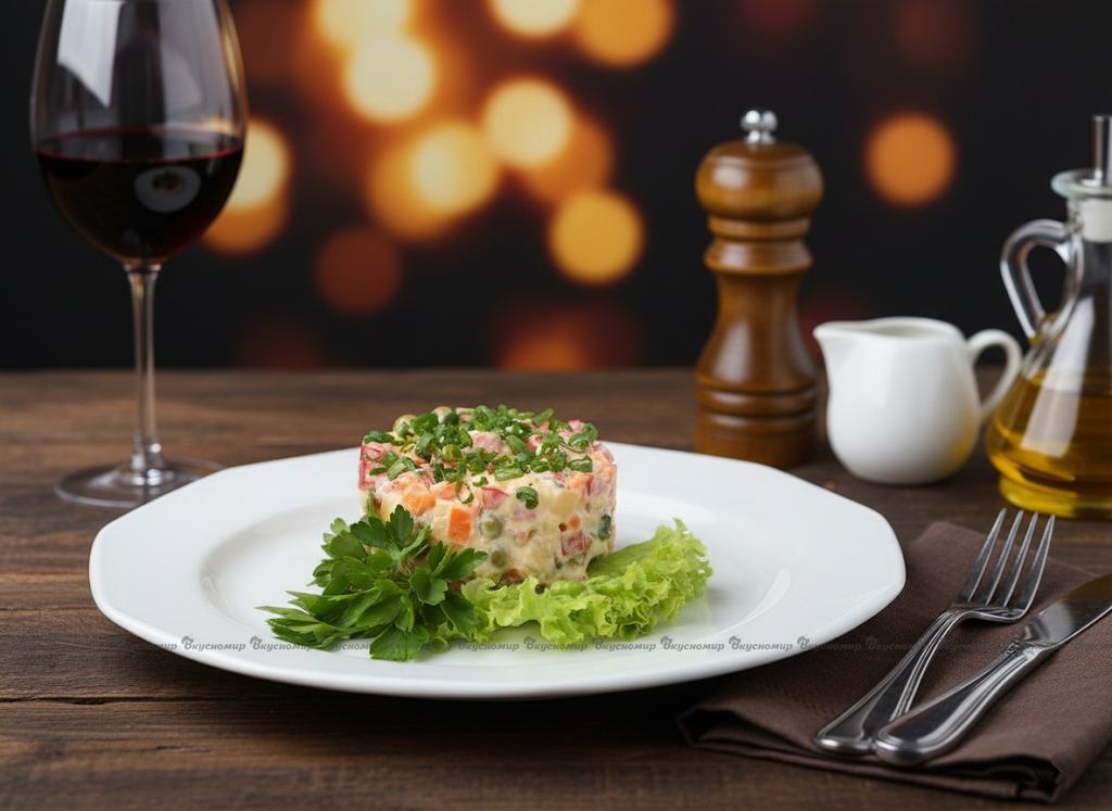 | Состав | Отварные картофель и морковь, колбаса ветчинная, перец болгарский сладкий, горошек зелёный консервированный, майонез, лук зеленый, оливки. |