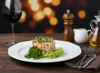 Этот салат относится к блюдам украинской кухни, довольно прост в приготовлении и по-домашнему вкусный. Ингредиенты нарезаются мелким кубиком, салат заправляется майонезом, при оформлении посыпается зеленью.
