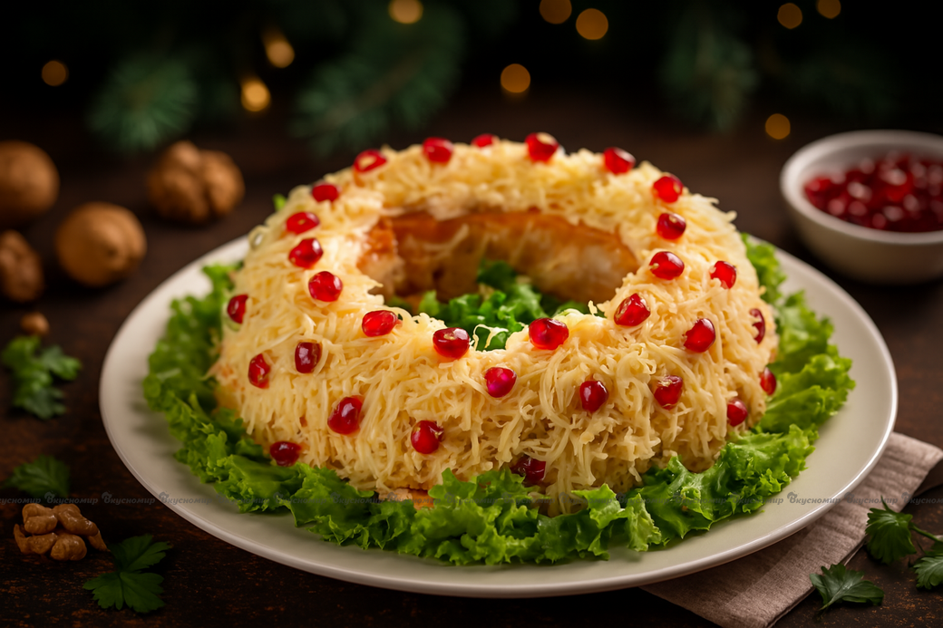 Яркий, нарядный салат. Помимо оригинального и приятного вкуса салат выглядит по-настоящему сказочно и аппетитно. Ингридиенты выкладываются слоями в форме браслета. Сверху оформляем зернами граната.