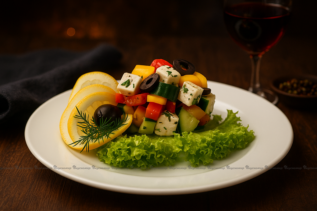 Легкий, вкусный и яркий овощной салат любим во всем мире. Нарезается крупным кубиком, поливается заправкой из растительного масла с добавлением лимонного сока, украшается дольками лимона и оливками.