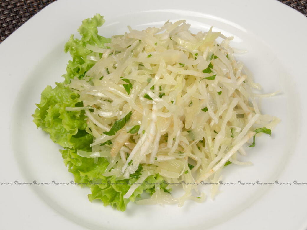 | Состав | Капуста свежая, корень сельдерея, яблоко, заправка (масло растительное, сок лимона, соль, специи). |