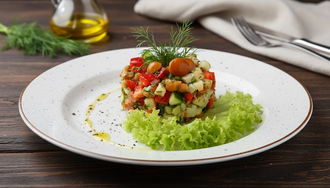| Состав | Картофель отварной, грибы маринованные, огурец свежий, перец болгарский, помидор свежий, лук зеленый, зелень укропа, масло растительное, соль, специи. |