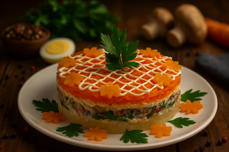 | Состав | Картофель отварной, морковь отварная, филе сельди, шампиньоны пассерованные с луком, яйцо отварное, майонез, соль, специи. |
