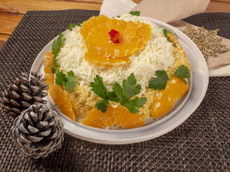 Салат «Праздничный вальс» вскружит голову вашим гостям! Этот салат с копченой курицей выделяется в мире кулинарии необычным насыщенным вкусом и сладким цитрусовым ароматом. Салат «Праздничный вальс» очень сытный и гармоничный. Копченое куриное мясо отлично сочетается с шампиньонами, свежим огурцом, отварным яйцом и орехом. Салат станет отличным украшением праздничного стола!