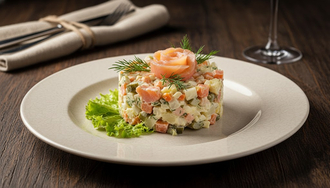 | Состав | Семга слабосоленая, картофель и морковь отварные, соленый огурец, яйцо отварное, майонез, оливки без косточки и фаршированные, зелень. |