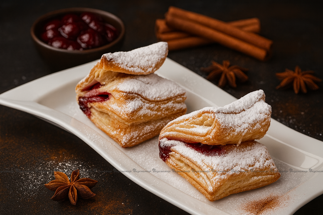 Сочная и ароматная начинка из сладкой вишни с тонкой ноткой корицы изумительно сочетается с пушистым слоеным тестом. Воздушная и очень нежная слойка просто создана для уютного семейного чаепития.