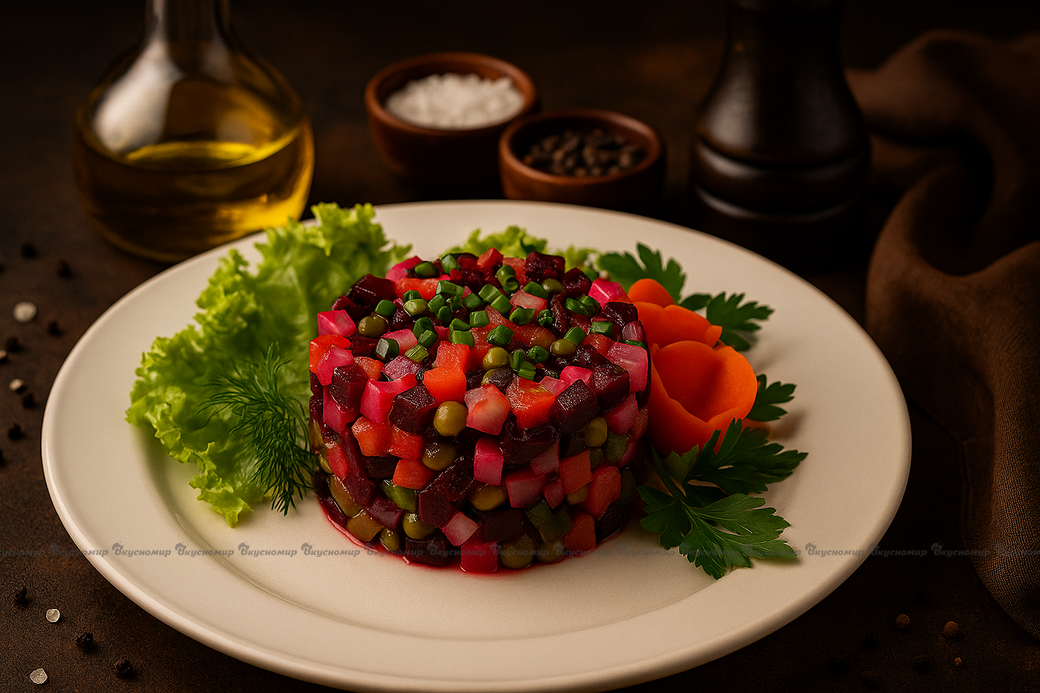 | Состав | Свекла отварная, картофель и морковь отварные, соленый огурец, горошек консервированный, лук репчатый, масло растительное, соль, перец. |
