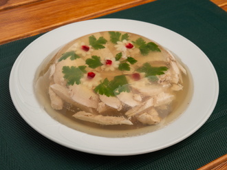 | Состав | Курица мякоть отварная 250г, бульон 250г, чеснок, желатин, специи. |