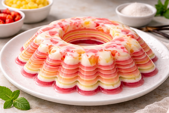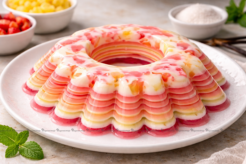 Легкий, прохладный летний десерт с различными фруктовыми оттенками и приятным молочным послевкусием. Разноцветное многослойное лакомство так любимое всей детворой.